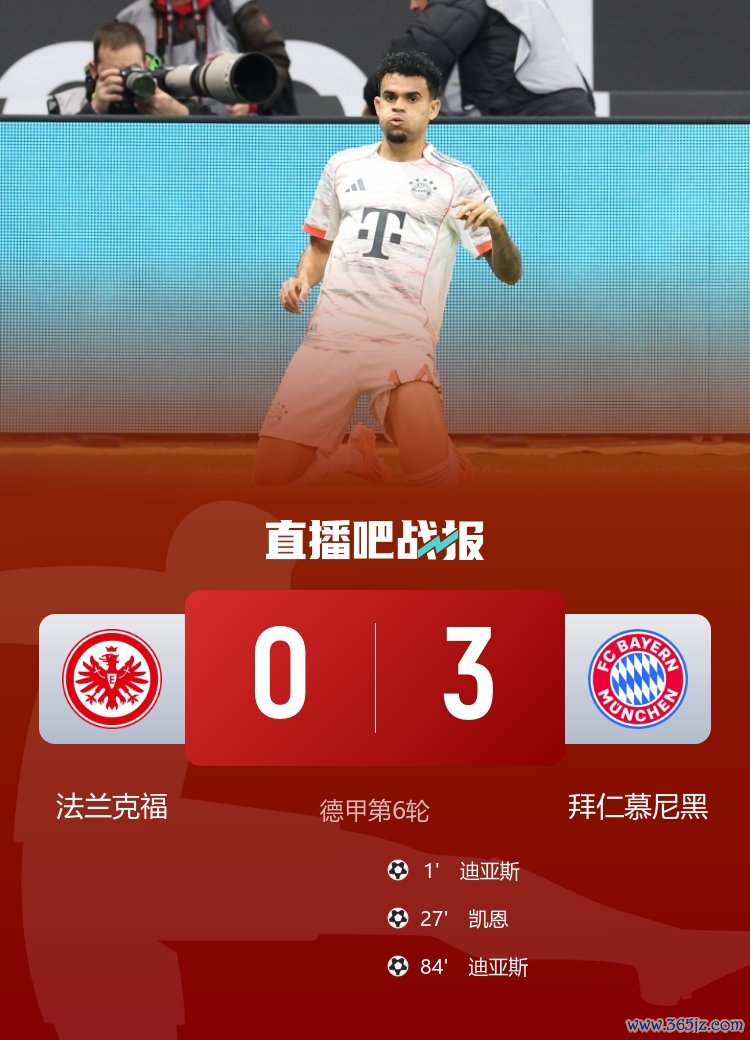 拜仁3-0法兰克福开赛全胜4分领跑 路易斯-迪亚斯两射一传凯恩破门