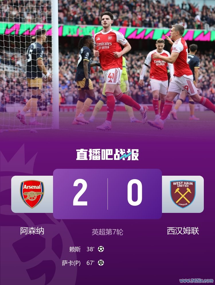 登顶!阿森纳2-0西汉姆 赖斯破旧主+伤退萨卡点射厄德高伤退