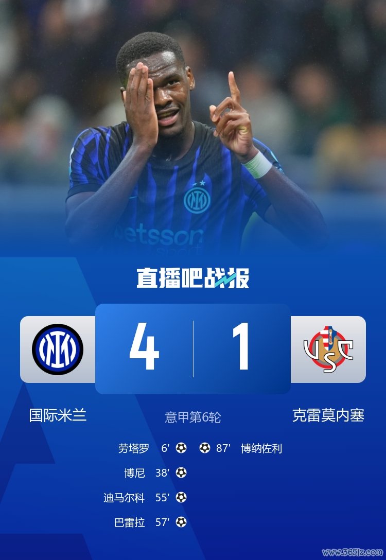 博尼1射3传!劳塔罗、迪马尔科、巴雷拉破门;国米联赛3连胜暂升第4,各赛事取5连胜。