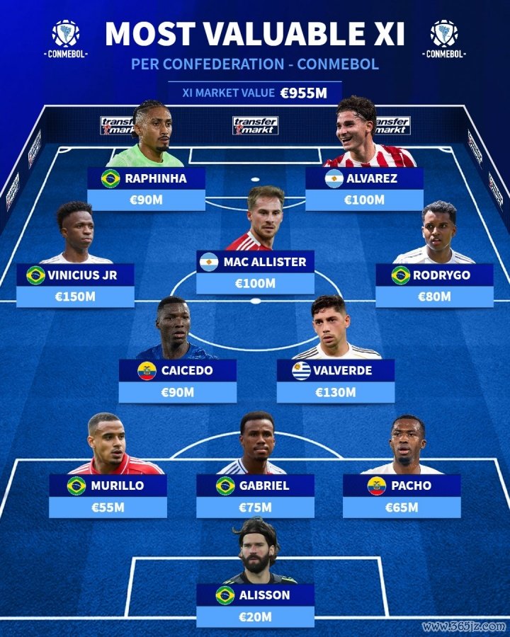 总身价9.55亿欧!南好意思足联最贵阵:维尼修斯领衔,皇马3东说念主赤军2东说念主