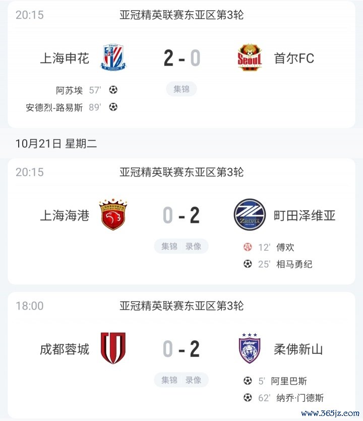 上海申花2-0打败首尔FC,上海海港0-2不敌町田泽维亚,成王人蓉城0-2不敌柔佛新山。
