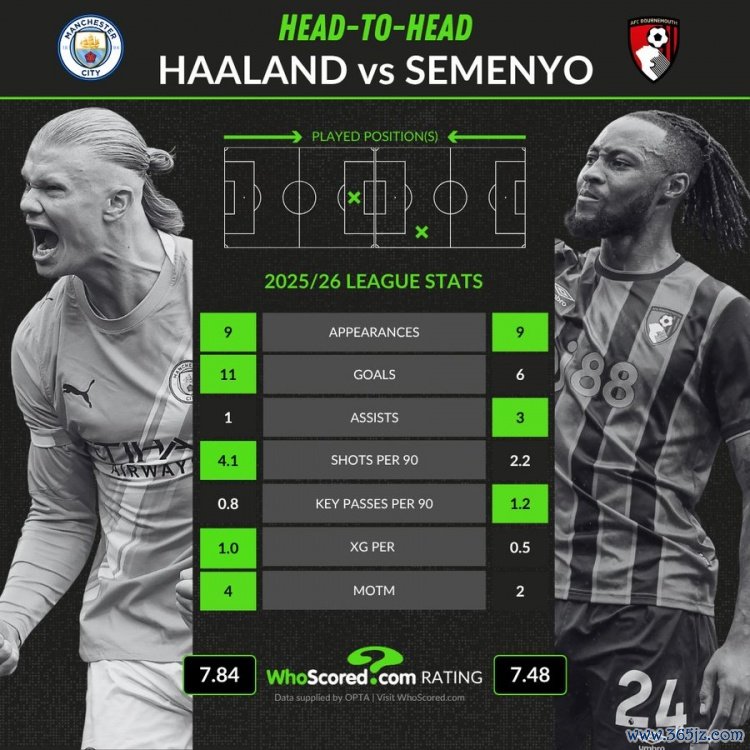 11月3日讯 本轮英超,曼城将主场对阵伯恩茅斯。赛前WhoScored列出了两队主要得离婚哈兰德和塞梅尼奥的数据对比。