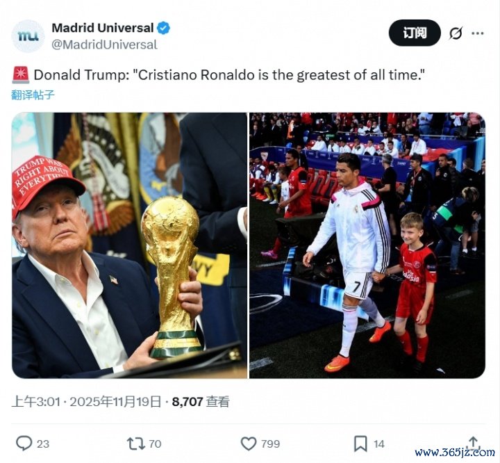 11月19日讯 此前报谈称,沙特王储穆罕默德·本·萨勒曼在白宫与特朗普会面,C罗受到特朗普招待。沙特王储与特朗普会面运转后,有多个博主、自媒体称特朗普默示:“C罗是历史最好球员。”