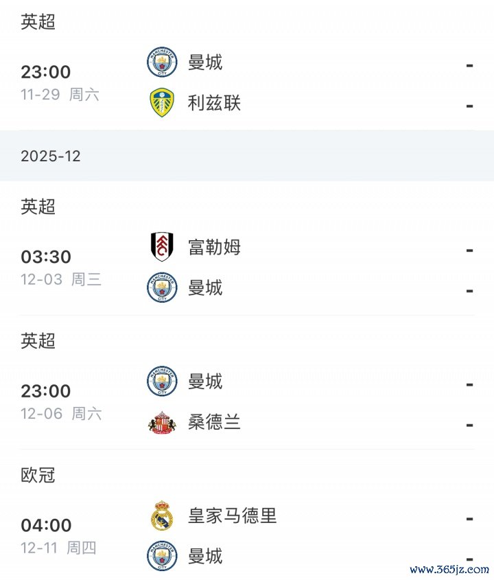 曼城之后3场比赛要在联赛先背面临利兹联、富勒姆和桑德兰,然后不才一轮欧冠面临皇马。