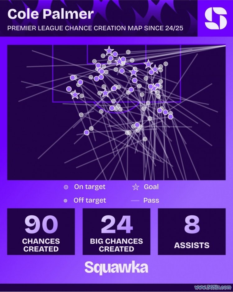 帕尔默上赛季以来英超创造24次首要契机,仅少于萨拉赫