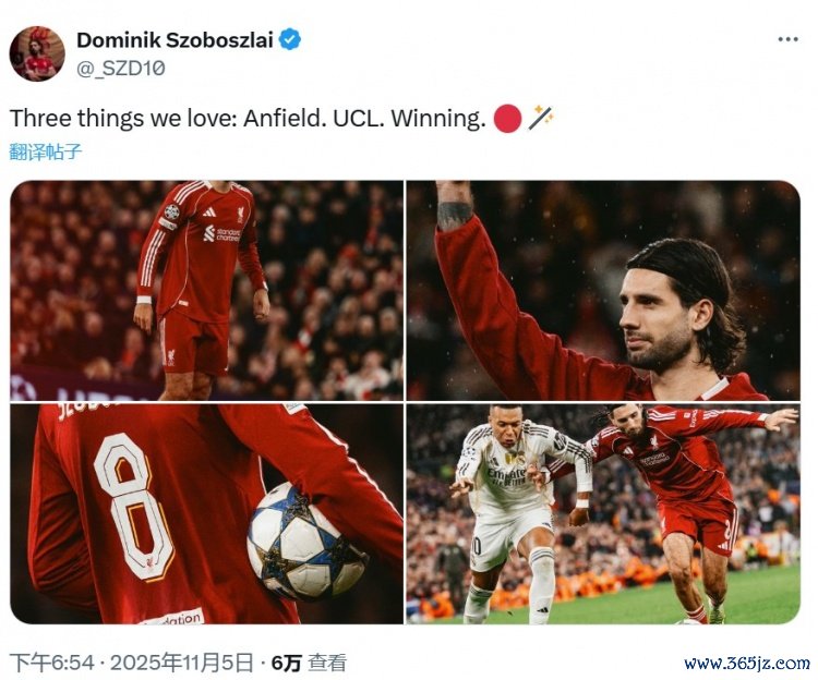 索博斯洛伊晒出赛场相片,并配文写谈:“咱们敬爱的三件事:安菲尔德、欧冠、告捷。”