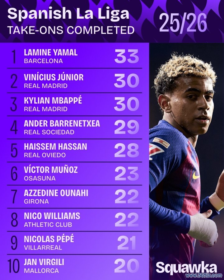 11月12日讯 巴萨亚马尔、皇马的姆巴佩和维尼修斯,他们在过东说念主残害方面,皆有着超卓的资质。在2025-26赛季西甲联赛中,据Squawka数据统计,亚马尔在过东说念主次数排名榜单居首。