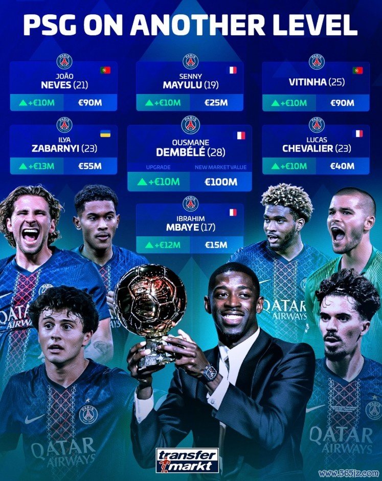 德转列巴黎多东谈主身价高潮:登贝莱、维蒂尼亚、内维斯在列