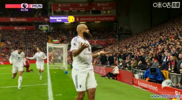 10月19日讯 英超第8轮利物浦vs曼联,曼联先进一球,开场只是62秒,阿玛德助攻,姆伯莫破门,1-0逾越利物浦。
