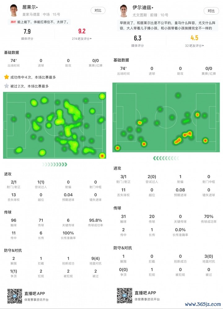 10月23日讯 欧冠联赛阶段第3轮,皇马主场1-0尤文,居莱尔与伊尔迪兹均首发出场74分钟被换下,居莱尔当选MVP,伊尔迪兹被打全场第二低分。