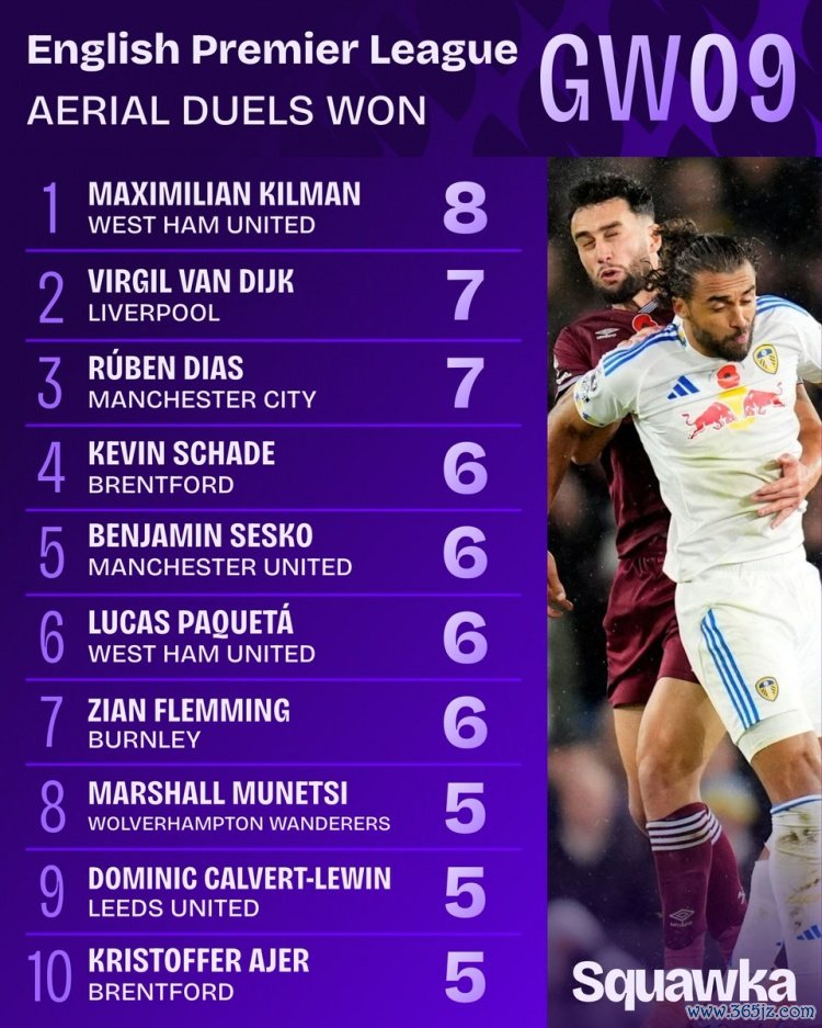英超第9轮获得空中起义次数榜:基尔曼8次最多,范戴克等两东谈主7次