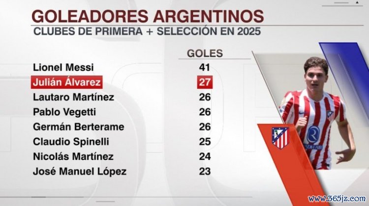 插足2025年,阿尔瓦雷斯在俱乐部和国度队已打进27球,阿根廷球员中仅次于梅西的41球。在阿尔瓦雷斯死后是劳塔罗(26球)、维格蒂(26球)、贝尔泰拉梅(26球)、斯皮内利(25球)、尼古拉斯-马丁内斯(24球)以及何塞-洛佩斯(23球)。