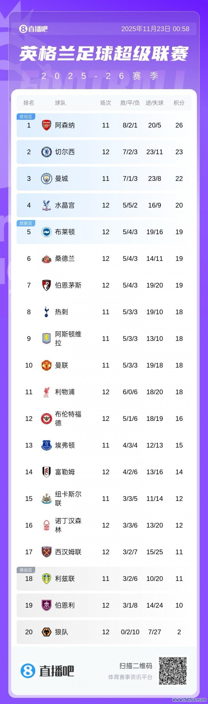 11月23日讯 英超第12轮,利物浦主场不敌诺丁汉丛林,最新积分榜方位如图。