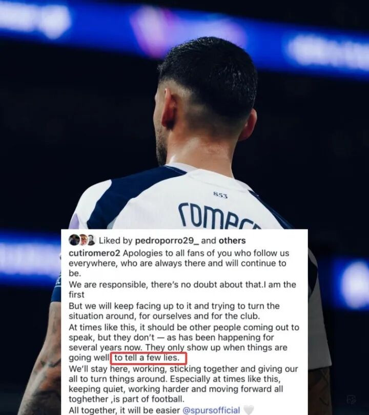 罗梅罗并非惟一抒发起火的热刺球员。两名队友在帖子下留言支撑。他的防地搭档波罗写谈:“阿门。不息斗争,昆季。咱们还有许多仗要打。”时尚理查利森则留住了一个双手合十的情势标记,彰着也招供这番话。