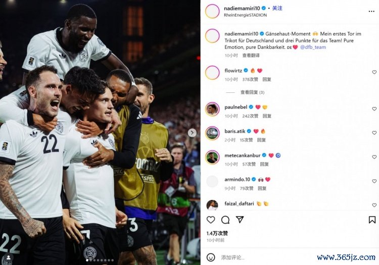 他也在赛后通过社媒晒出全队的庆祝照,并配文:“真实让东说念主鸡皮疙瘩王人起来了🙌我身披德国队战袍的首粒进球,为球队赢下了三分!无比欣喜,无比感德。”