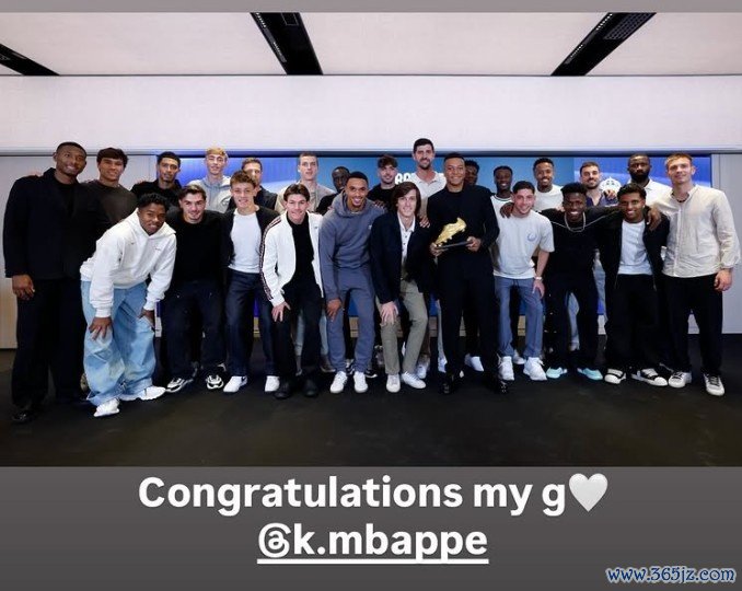 贝林厄姆也通过社媒晒出了皇马全队同手捏金靴奖杯姆巴佩的合影,并配文:“祝愿我的昆仲@姆巴佩”。
