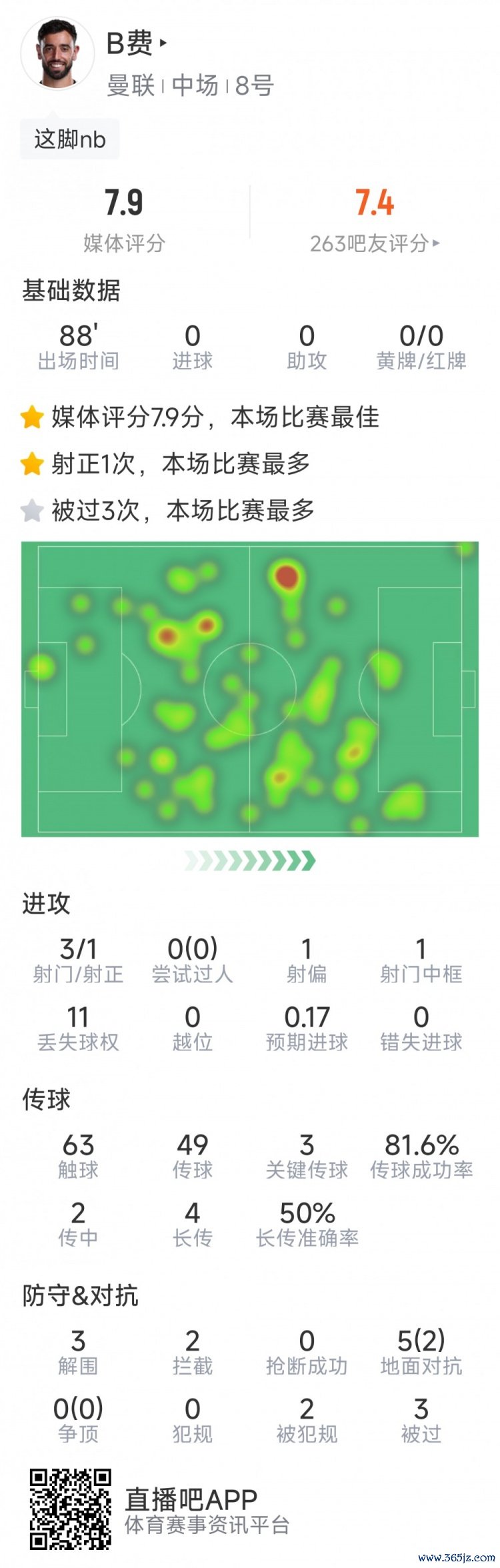 B费本场数据:3次关键传球,3射1正,1次中框,3次突围