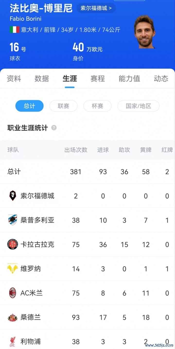 现年34岁的博里尼办事生计曾遵守于罗马、利物浦、AC米兰等队,办事生计盘曲多支球队;他在桑普多利亚遵守了两年,仅上场38次。今夏,他成为解放球员并加盟索尔福德城,签下一份短期公约。