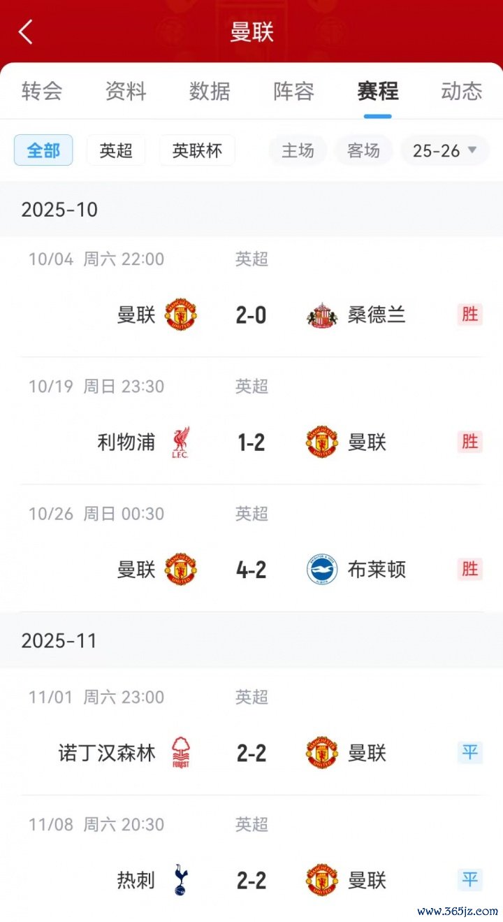 最近的五轮联赛中,曼联一度接连顺服桑德兰、利物浦、布莱顿,赢得三连胜;上轮联赛2-2战平丛林。本轮对阵热刺的比赛,曼联在全场补时阶段被反超的情况下,由德里赫特打进了绝平的进球,从客场带走一分。