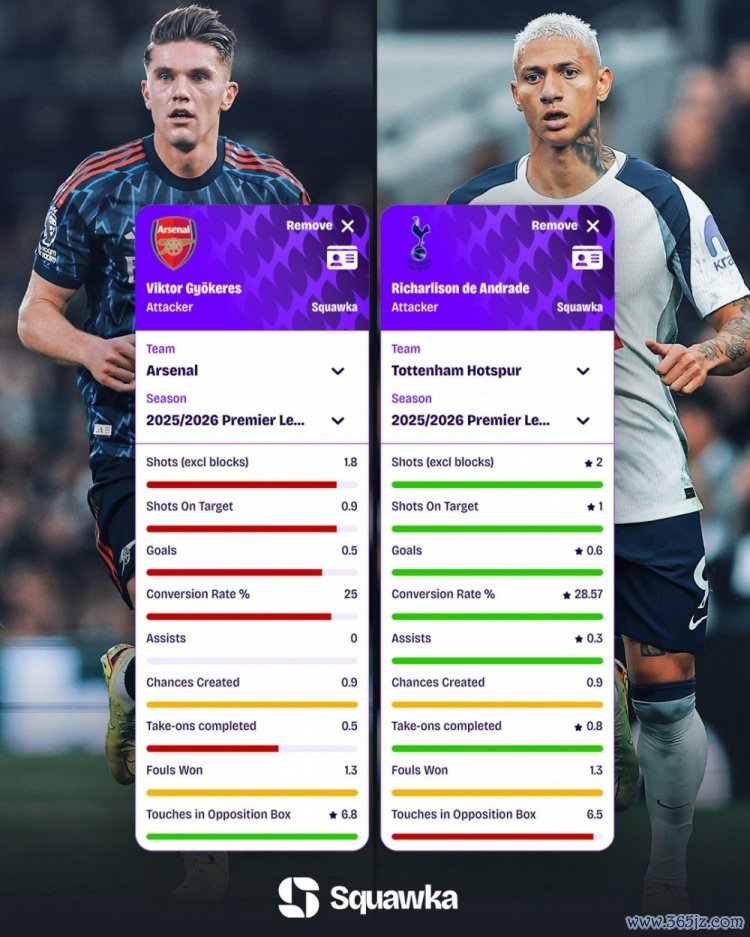 11月21日讯 英超行将战火重燃,北伦敦德比备受细心。数据机构squakwa也对比了两队中锋约克雷斯和里沙利松本赛季英超场均要道数据情况,后者多项数据占优。