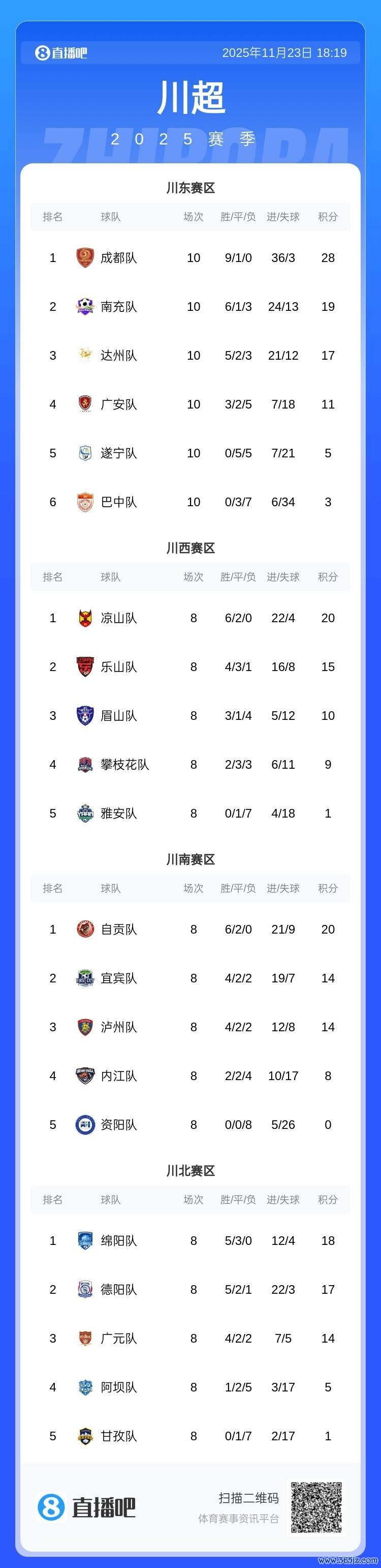 11月23日讯 川超联赛第一阶段分区赛末端,4个赛区共有9支球队晋级总决赛。