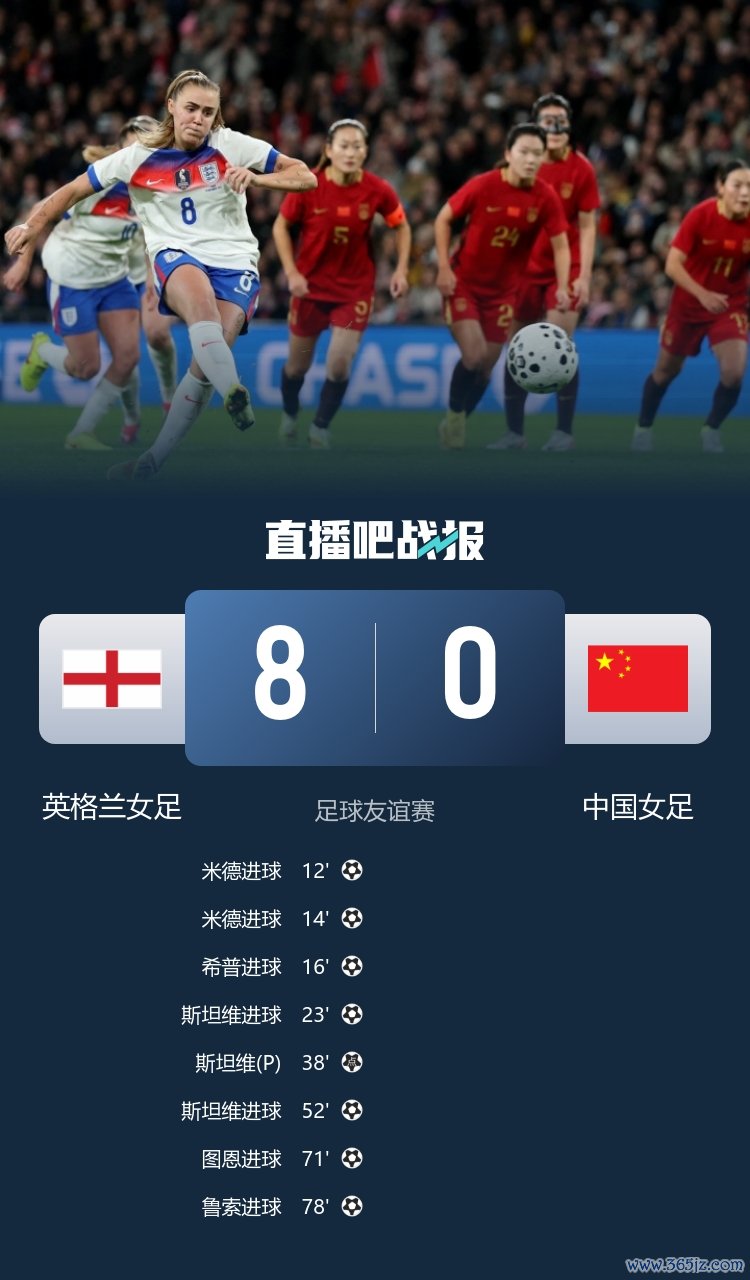 足球友谊赛,英格兰女足8-0大捷中国女足,女足全场遭压制,控球仅3成+6射门2射正。