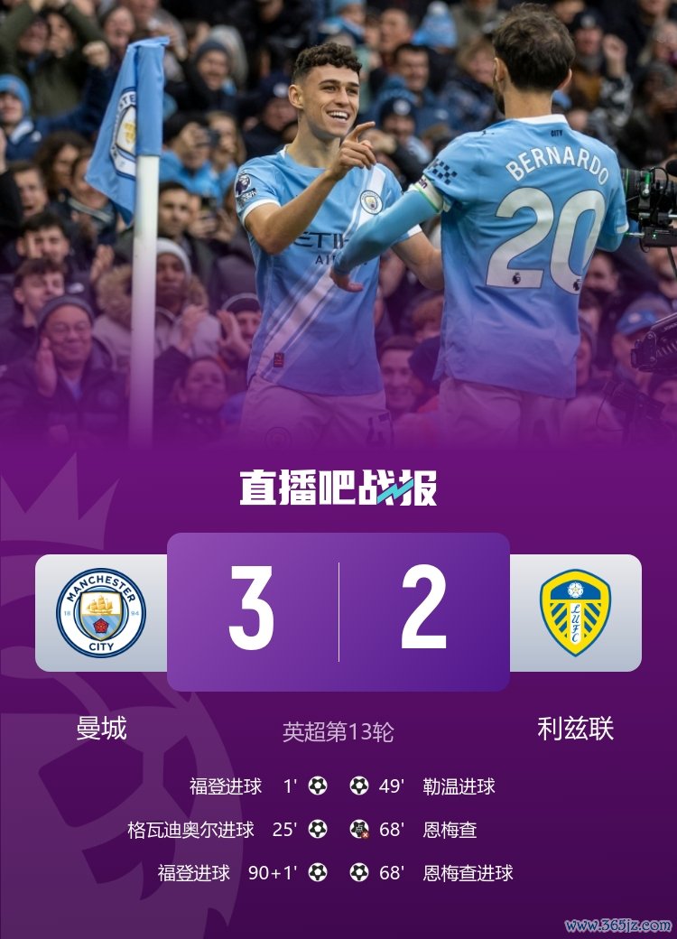 先赛距榜首4分!曼城3-2利兹联 福登双响+绝杀格瓦破门+送点