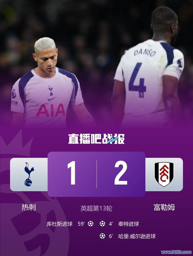 英超第13轮,热刺主场1-2不敌富勒姆,库杜斯破门。