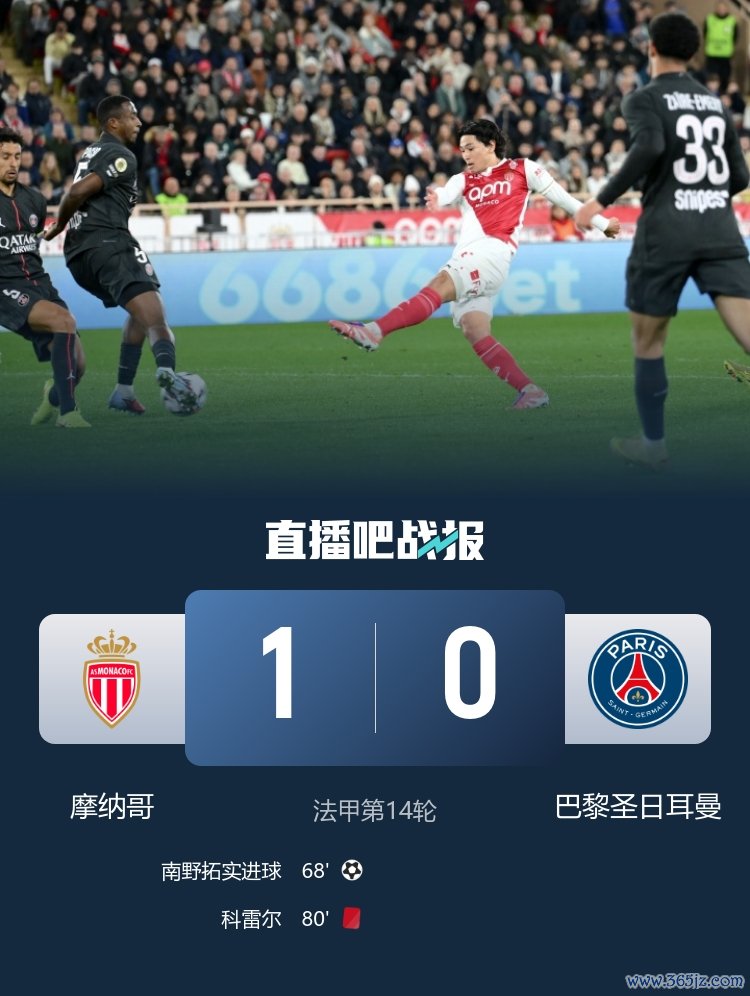 法甲第14轮,摩纳哥主场1-0驯顺巴黎圣日耳曼,南野拓实进球。