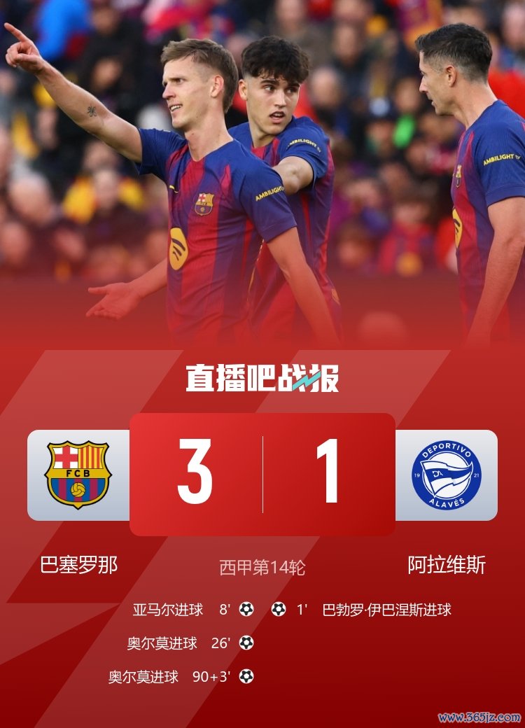 西甲第14轮,巴塞罗那3-1逆转阿拉维斯,亚马尔传射,奥尔莫梅开二度。