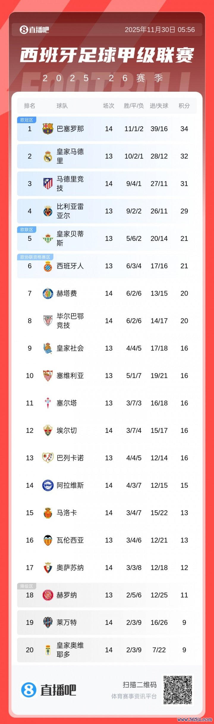 西甲积分榜:巴萨暂升榜首!皇马明晨客战赫罗纳,马竞暂升第3!
