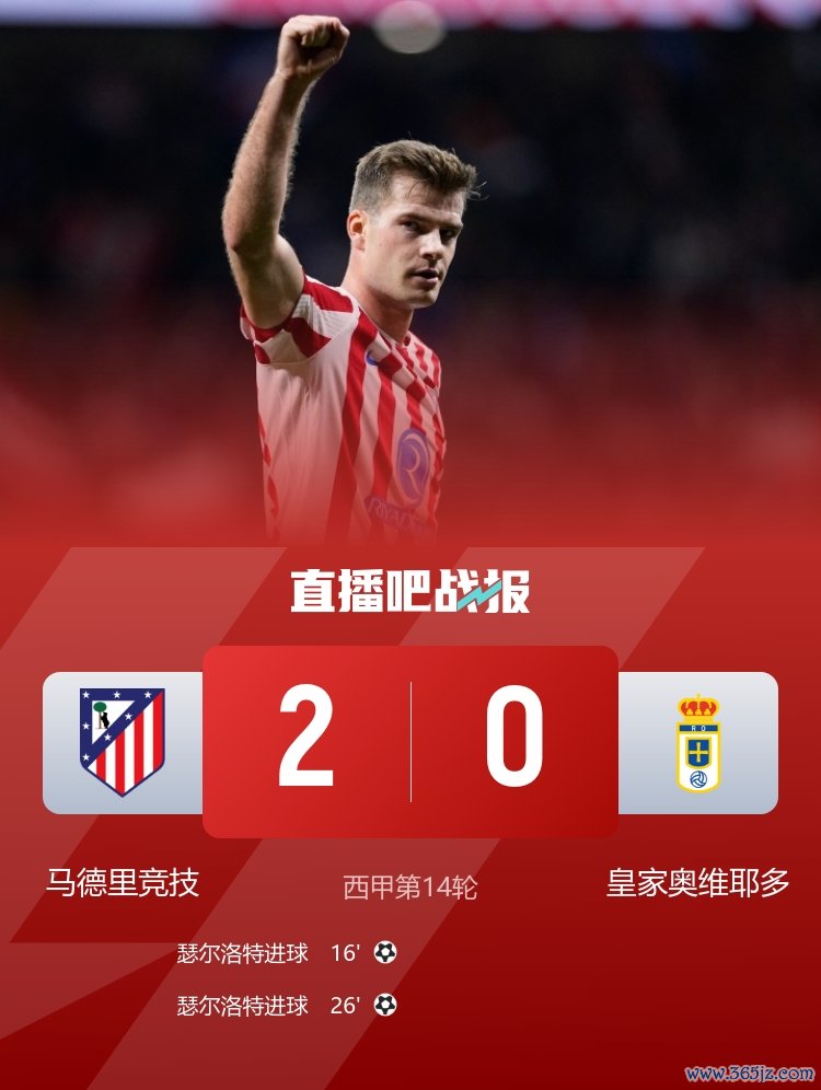 西甲第14轮,瑟尔洛特梅开二度,马德里竞技2-0皇家奥维耶多。